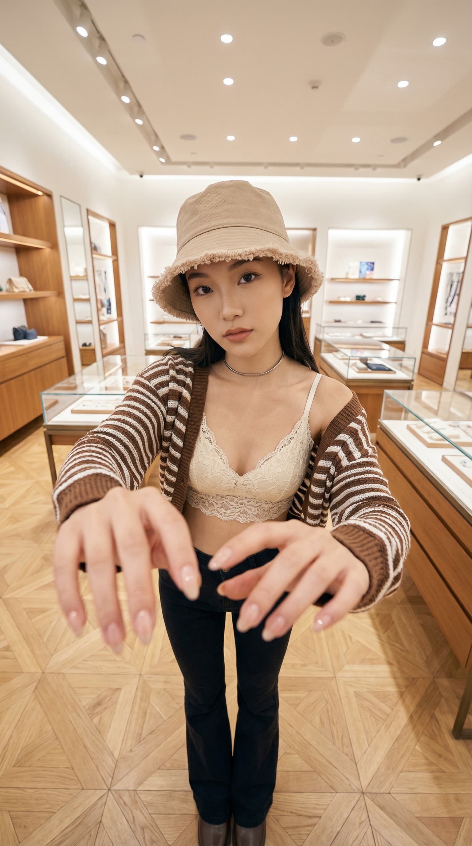 This image captures a young woman in a shop setting, styled with a casual bucket hat and cardigan. The wide-angle per...