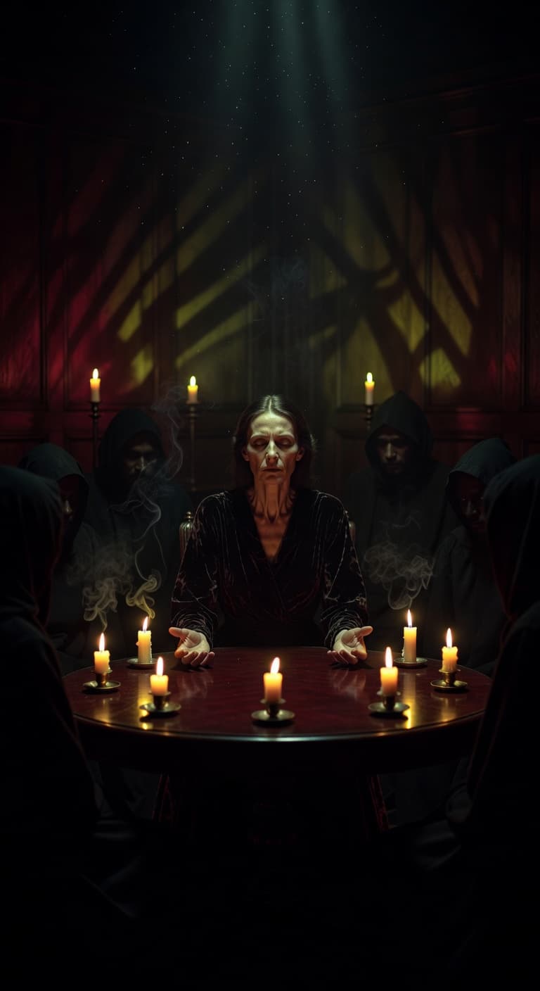 In a dimly lit room, a gathering of figures in hooded robes surrounds a wooden table illuminated by candlelight. A ce...
