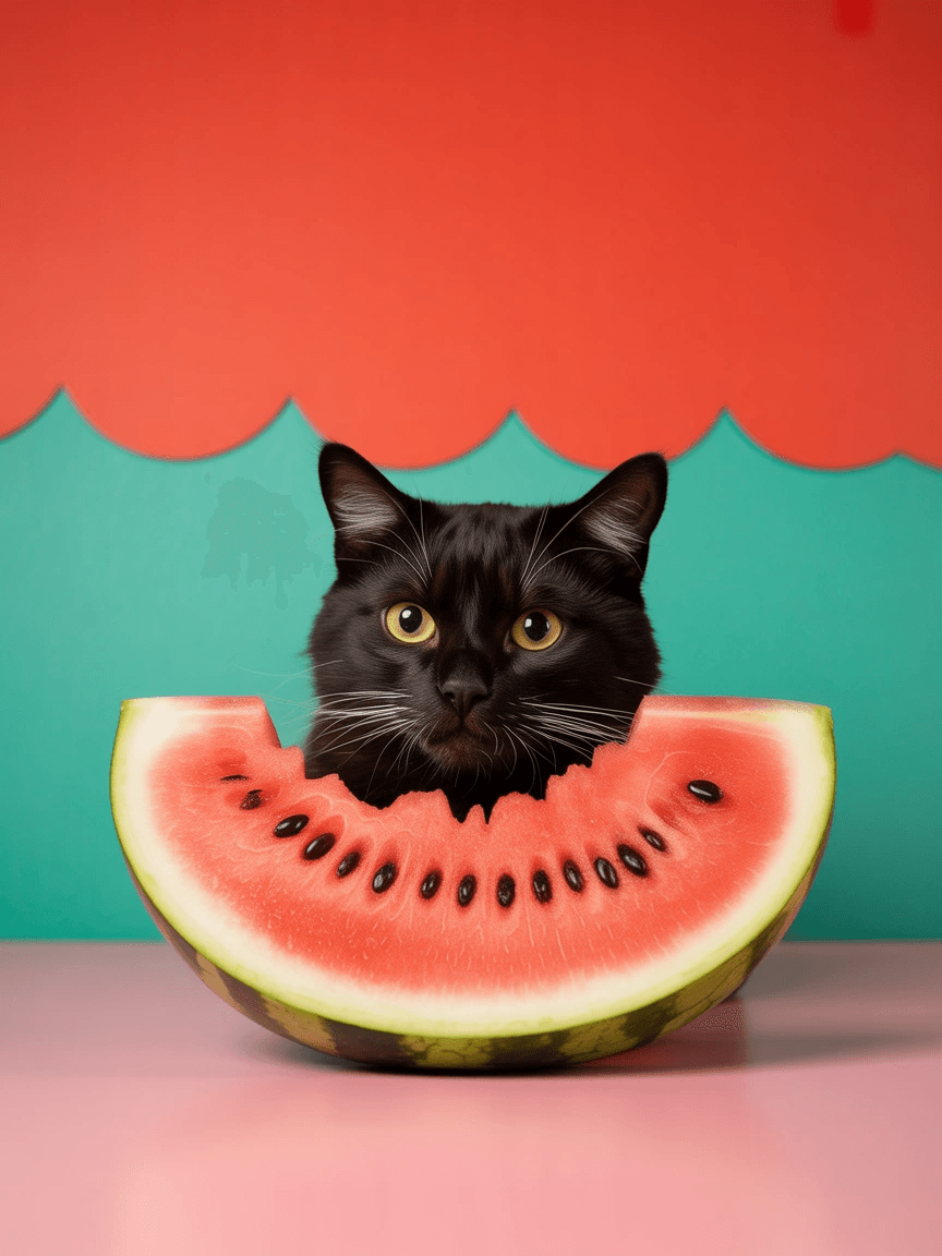 Black cat hiding behind a watermelon slice, professional studio shot, bright red...