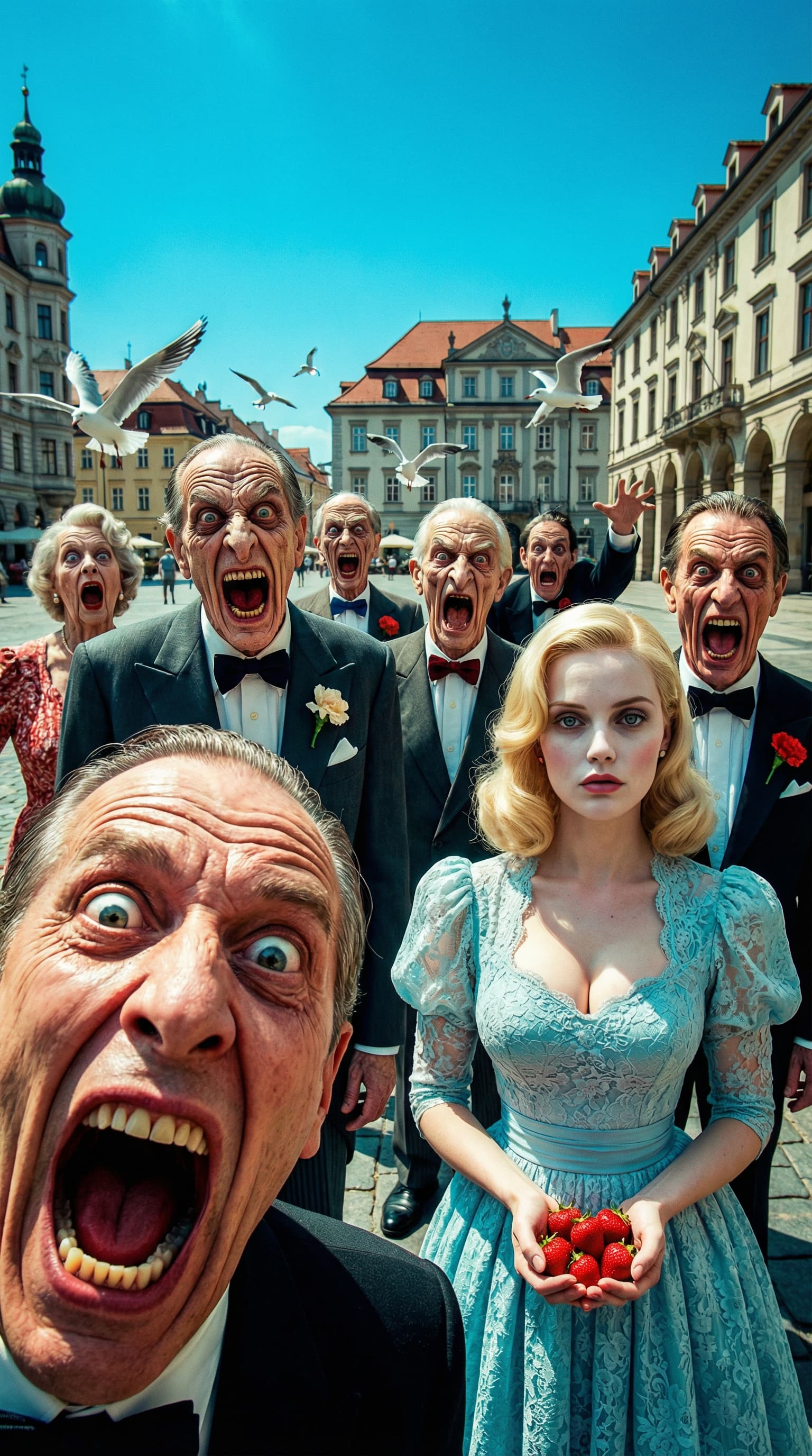 In a sunlit town square, a vintage-dressed woman clutches a handful of strawberries, surrounded by a chorus of scream...