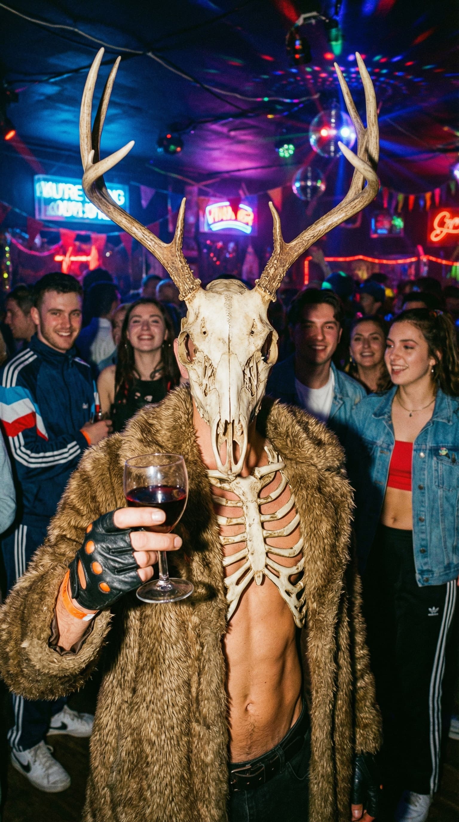 A figure in a deer skull mask and fur coat raises a glass of wine at a crowded nightclub. The scene is illuminated by...