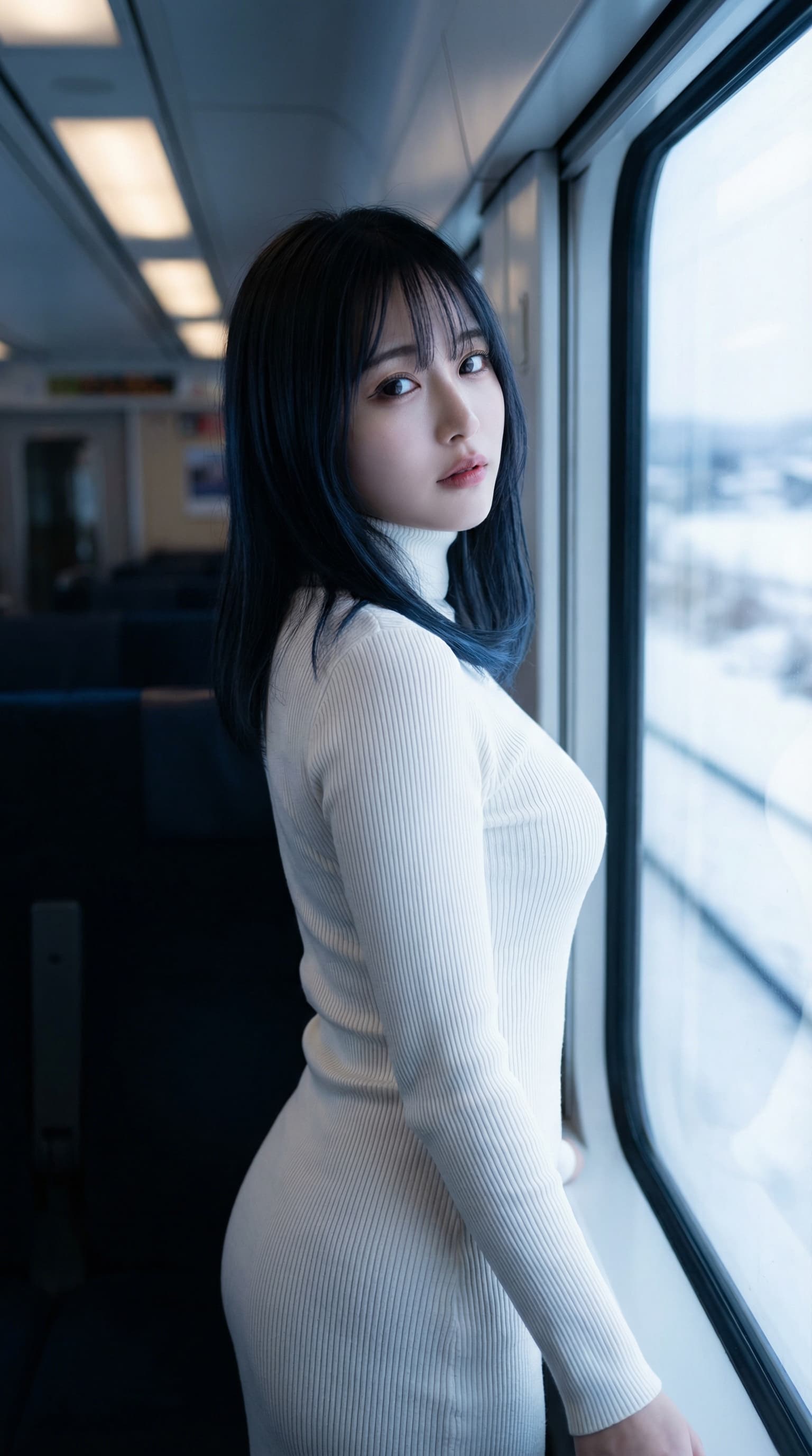 A woman in a white dress looks back at the viewer from a train car. Outside the window, a snowy landscape blurs past,...
