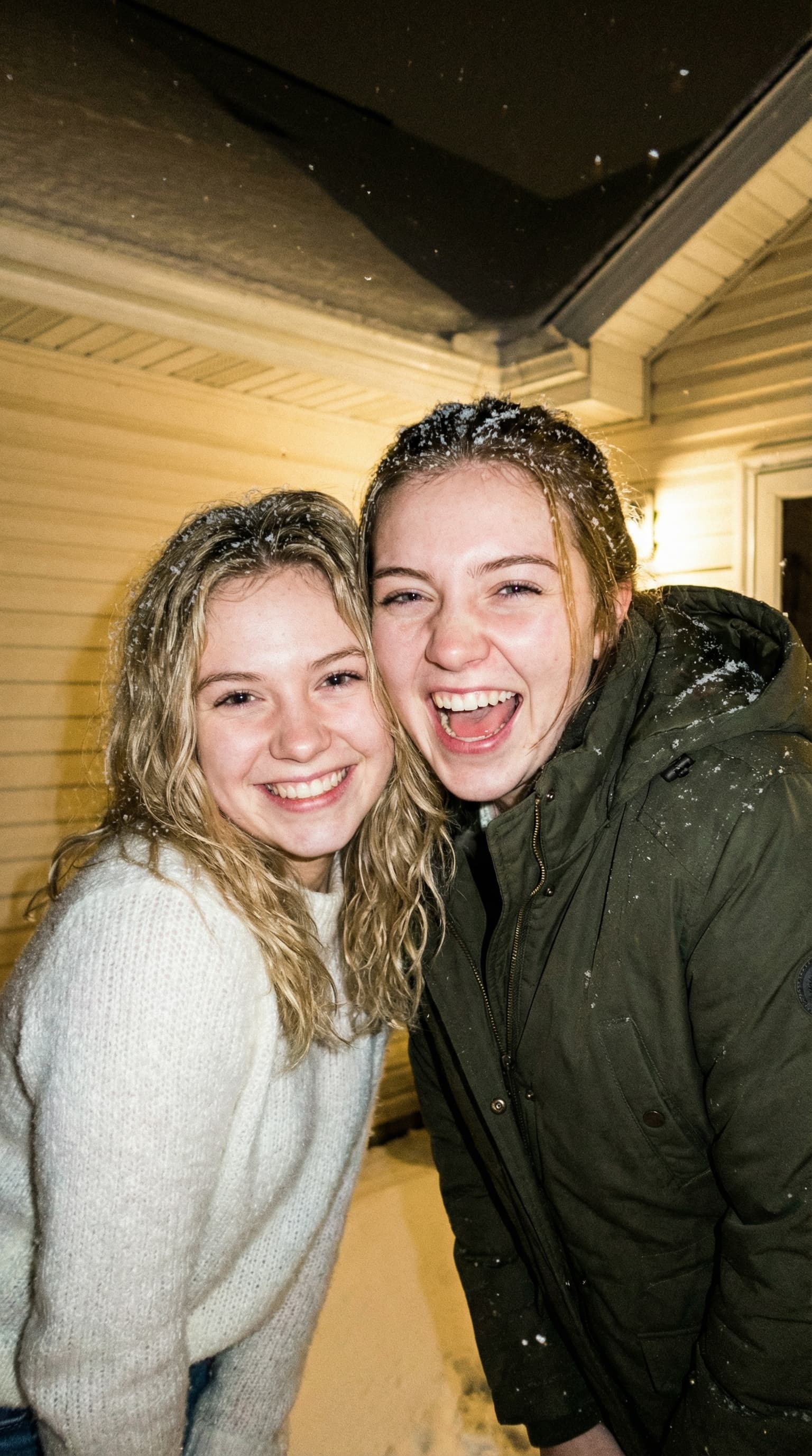 This candid portrait captures two young women laughing together on a snowy evening. The warm light from inside a hous...