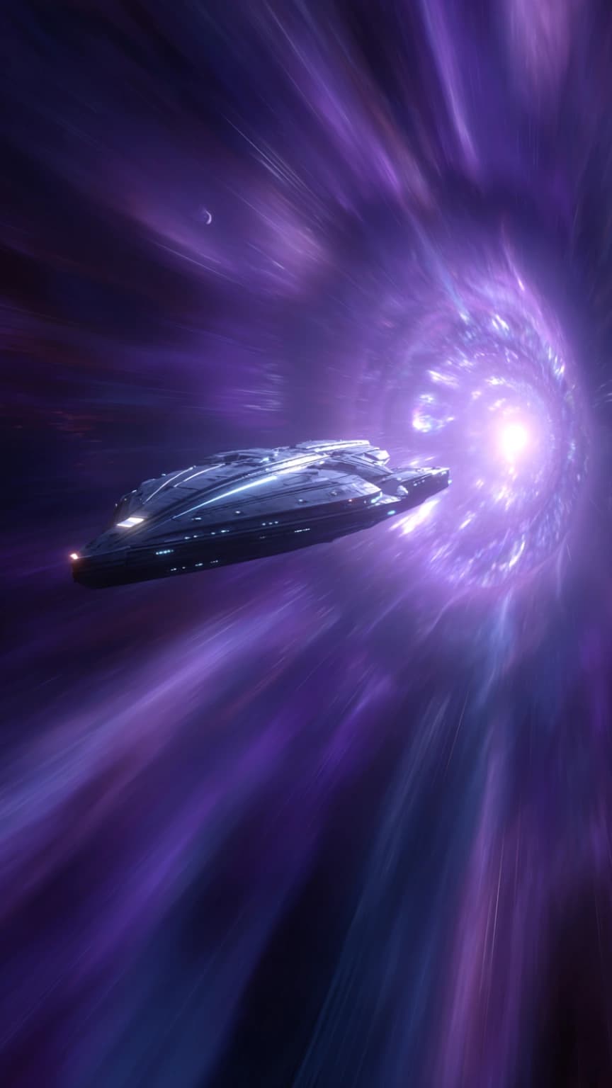 A wormhole transit sequence unfolds as a sleek, silver spacecraft pierces throug...