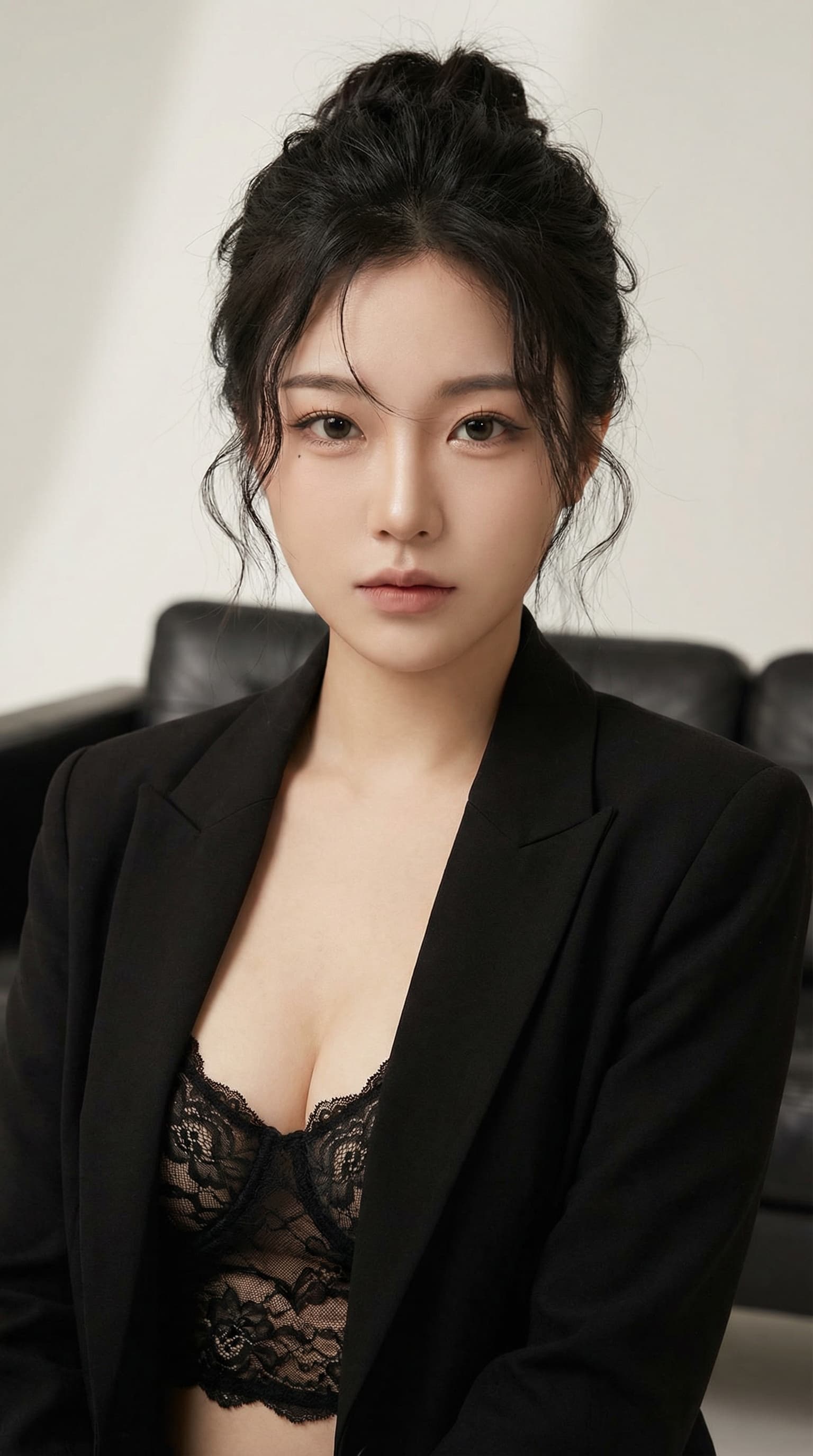 This portrait features a young woman in a black blazer and lace lingerie, looking directly at the viewer. The neutral...
