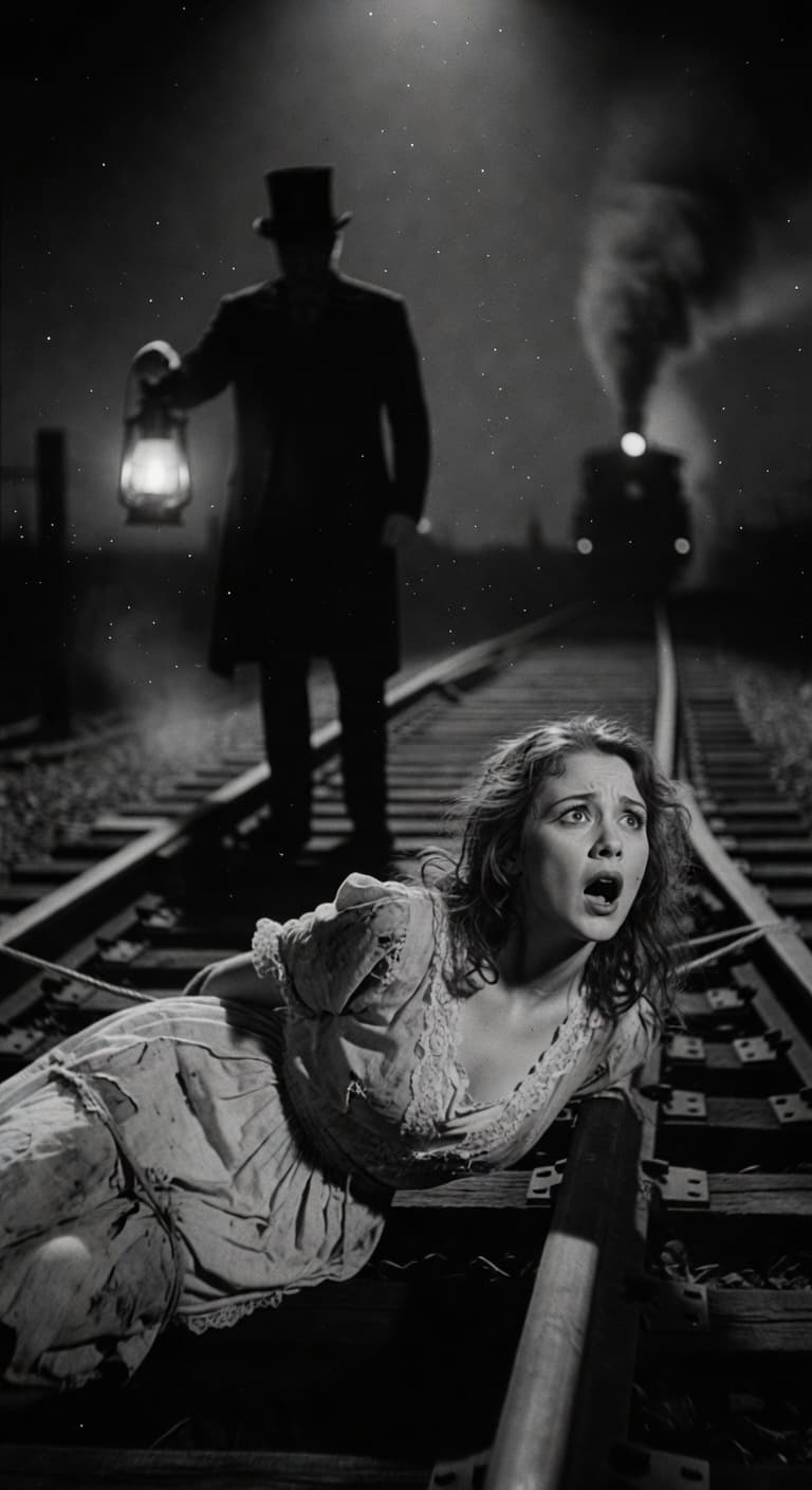 This black and white image depicts a damsel in distress tied to railroad tracks, with a villainous figure holding a l...