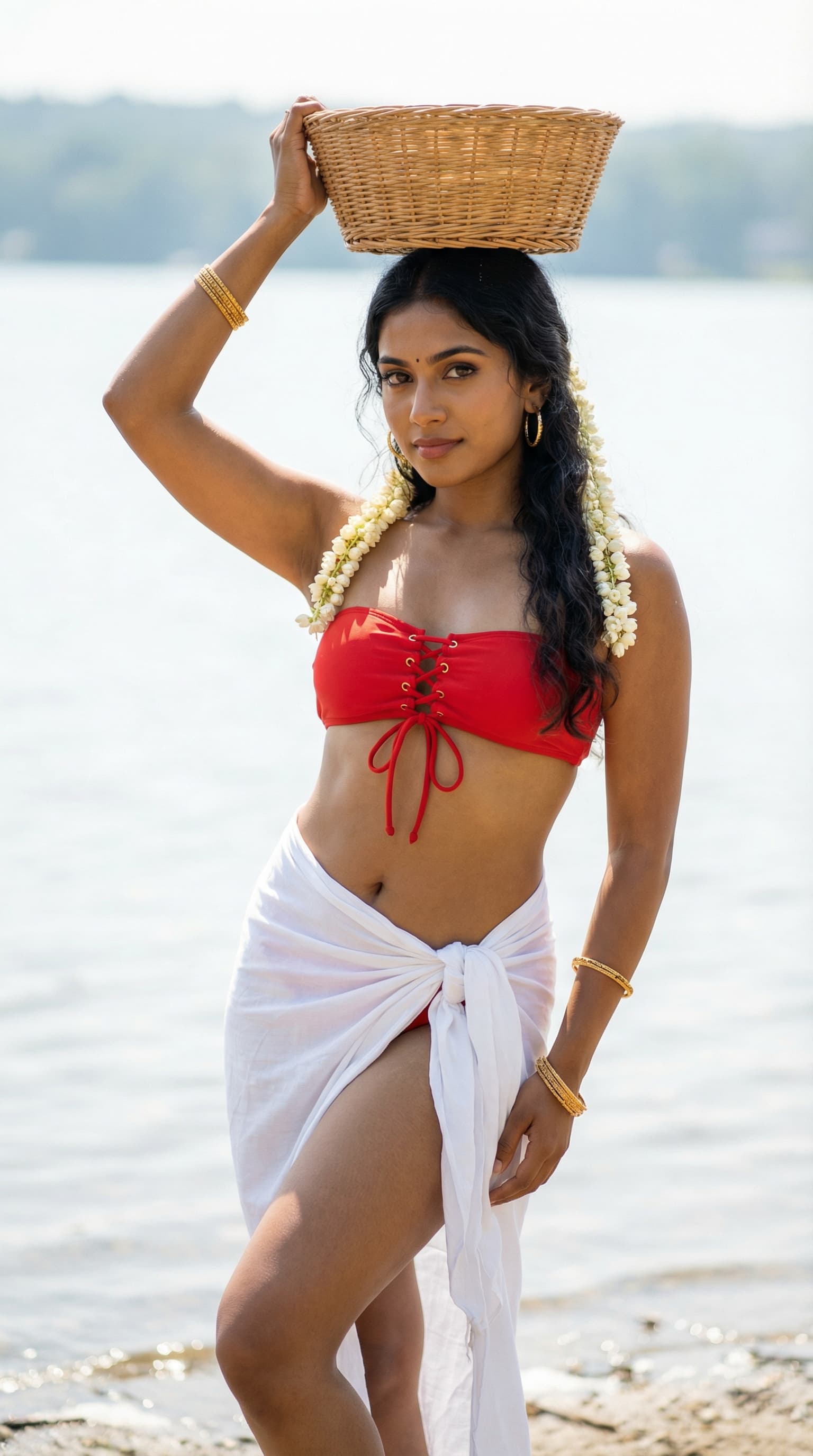 This sun-drenched image depicts a woman near the water's edge, adorned with gold bracelets and flowers, carrying a wo...