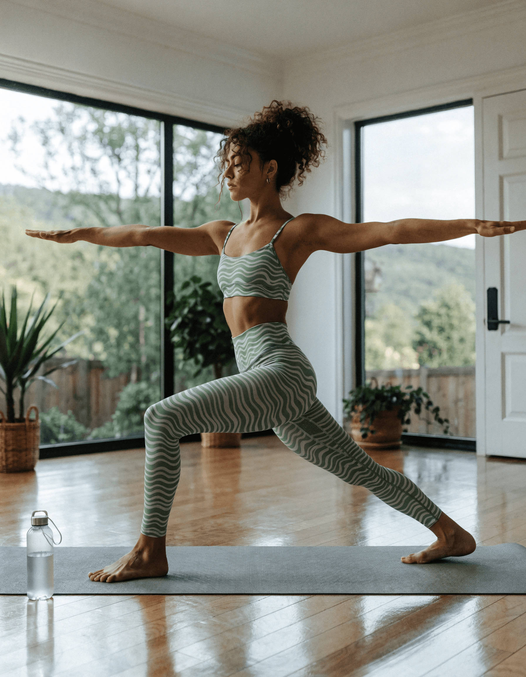 A woman strikes a warrior pose in a sun-drenched studio. Floor-to-ceiling windows reveal a verdant landscape, contrib...