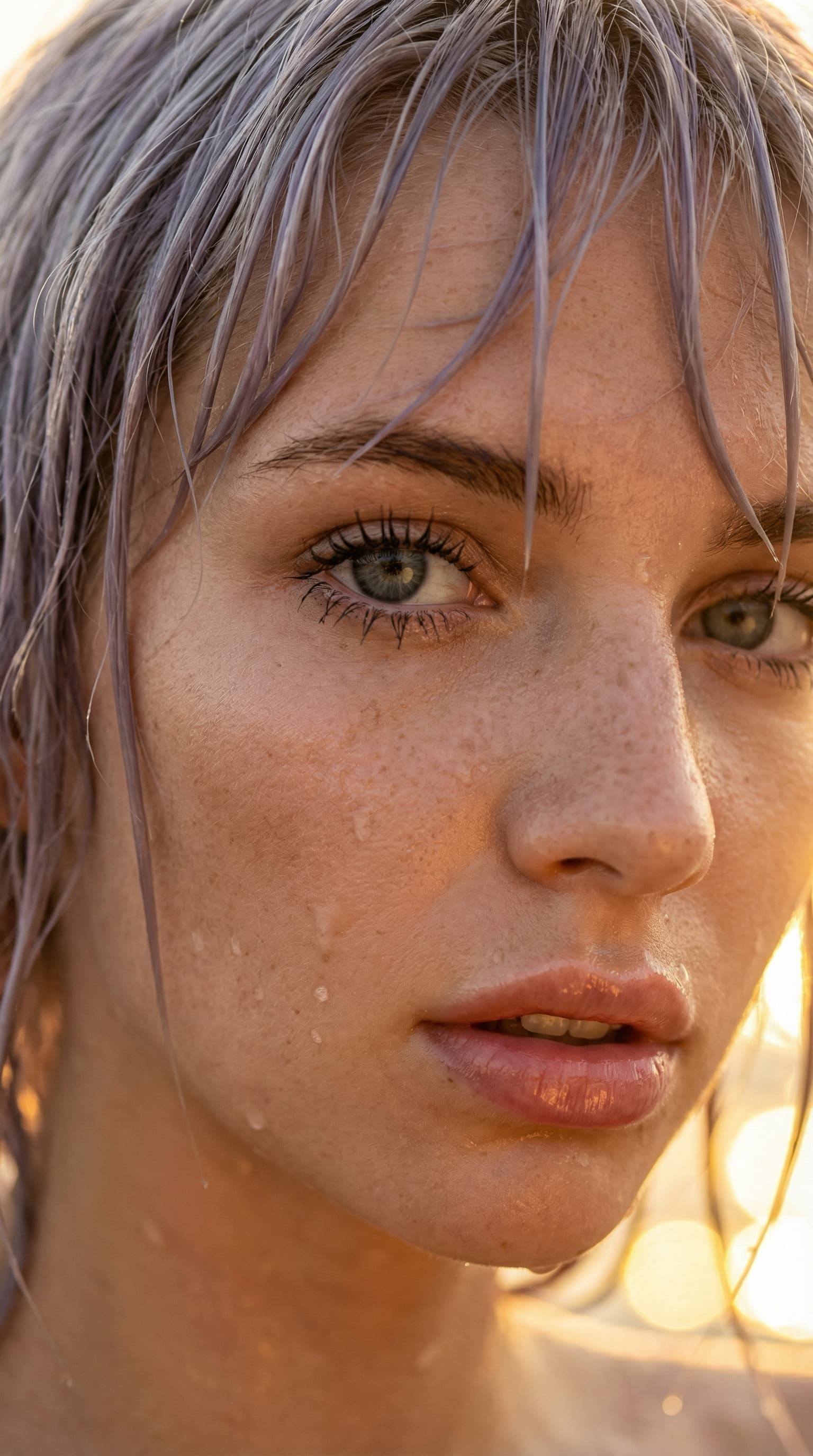 This intimate portrait captures a young woman with wet, lavender-tinged hair and glistening skin, bathed in golden li...