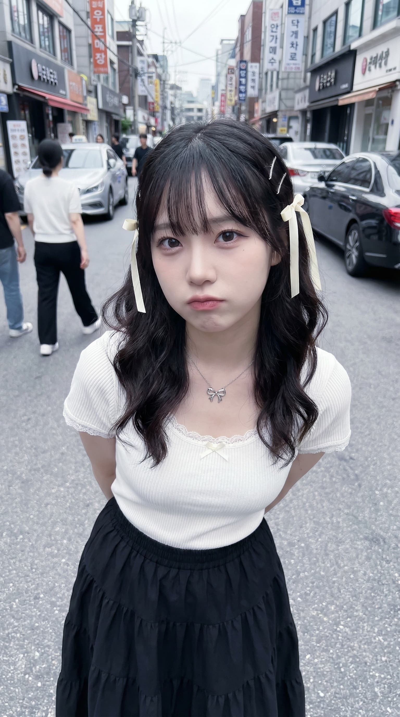 A young woman with dark hair stands on a city street, looking directly at the viewer with a slight frown. She wears a...