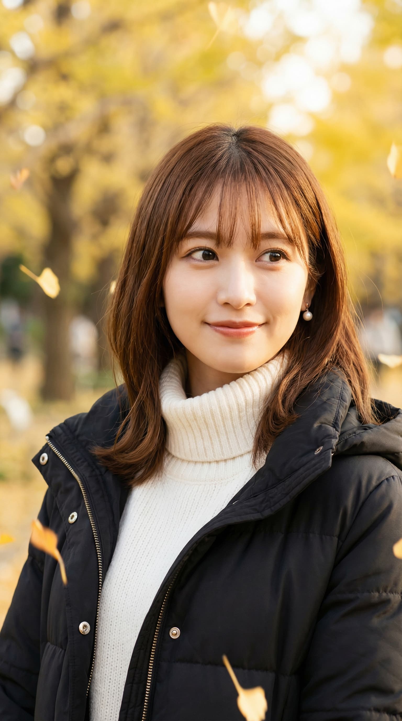 In this portrait, a young woman gazes serenely into the distance, framed by the soft, golden light of autumn. Leaves ...