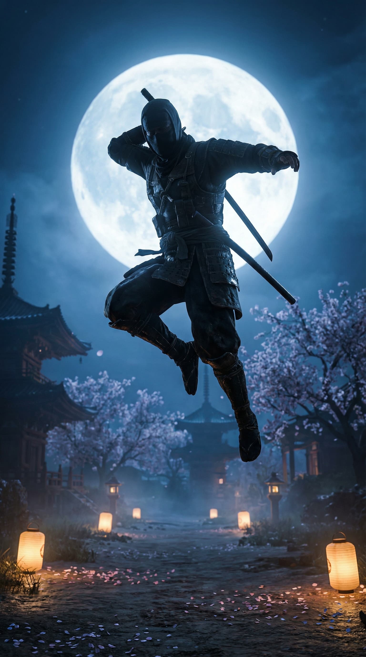 A ninja leaps in mid-air before a full moon, swords at his side. The setting is a Japanese garden with flowering cher...