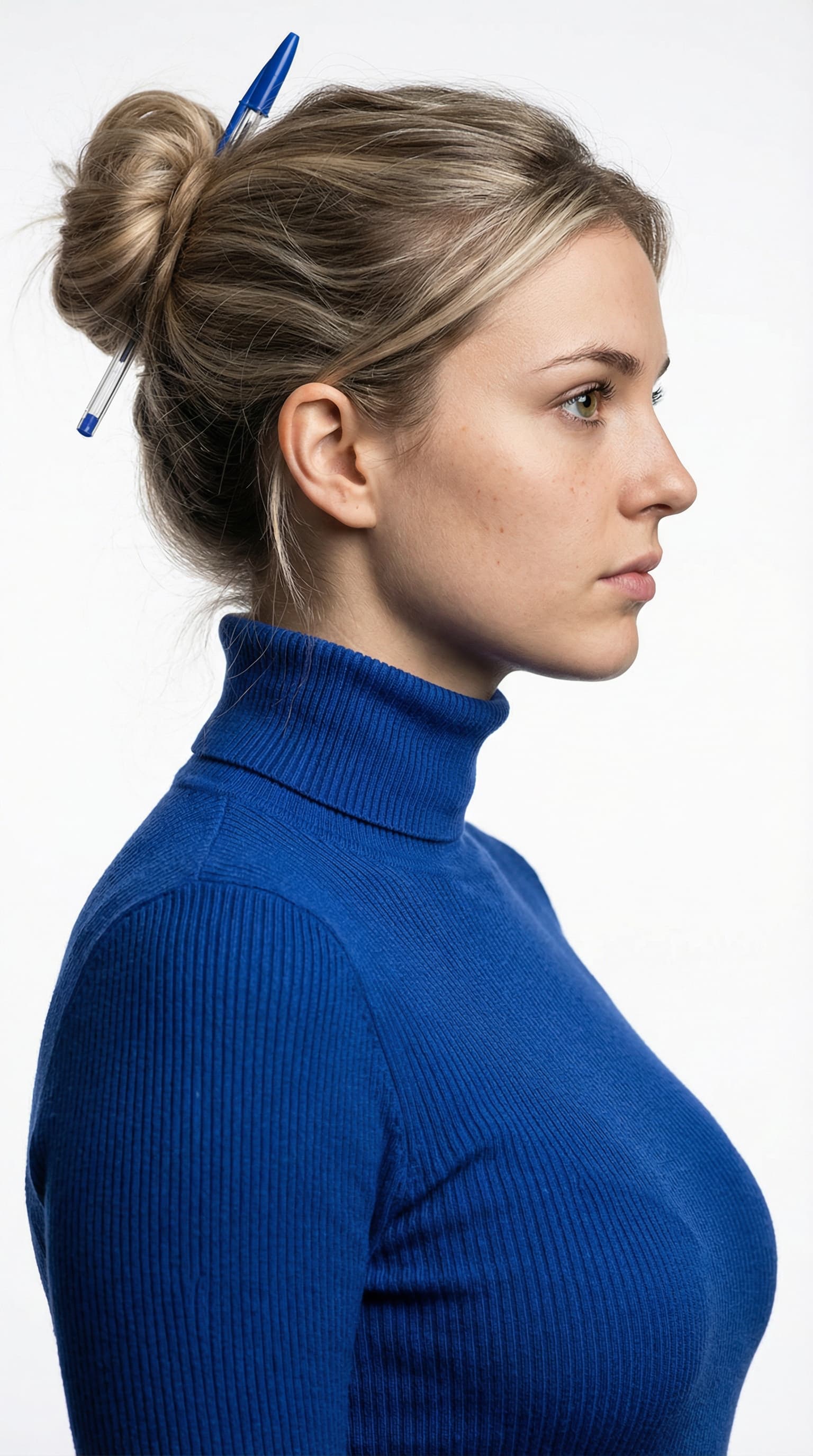 A profile portrait depicts a young woman in a bright blue turtleneck against a stark white background. Her hair is st...