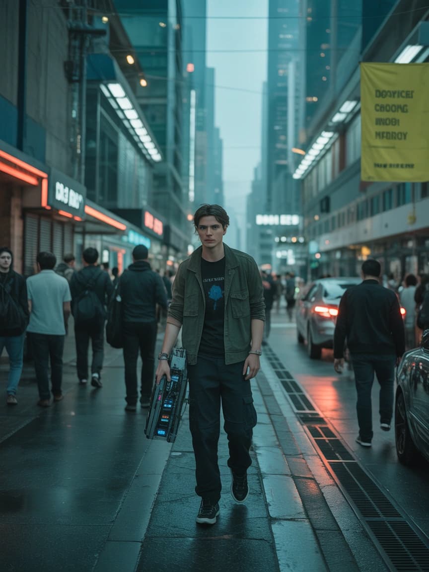 A young woman in a school uniform poses in a narrow urban alleyway. The composition emphasizes the stark contrast bet...