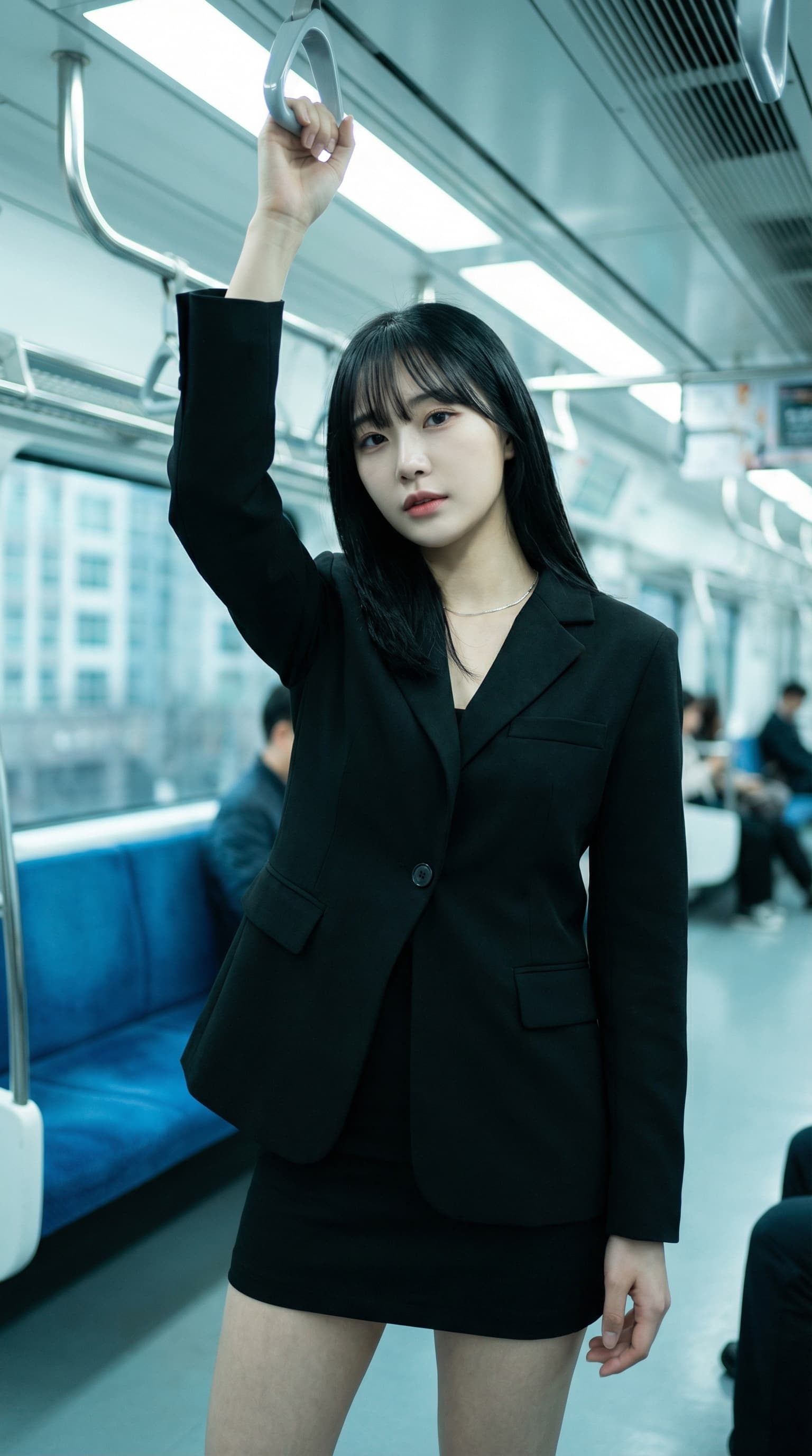 A young woman in a black suit stands in a subway car, holding onto a rail. Cool tones and naturalistic lighting creat...