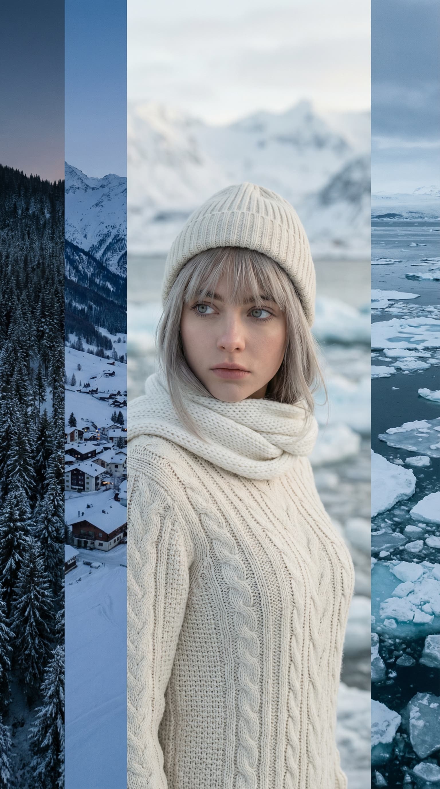 A young woman in a cream-colored sweater and hat stands against a backdrop of a stark winter landscape. The cool colo...