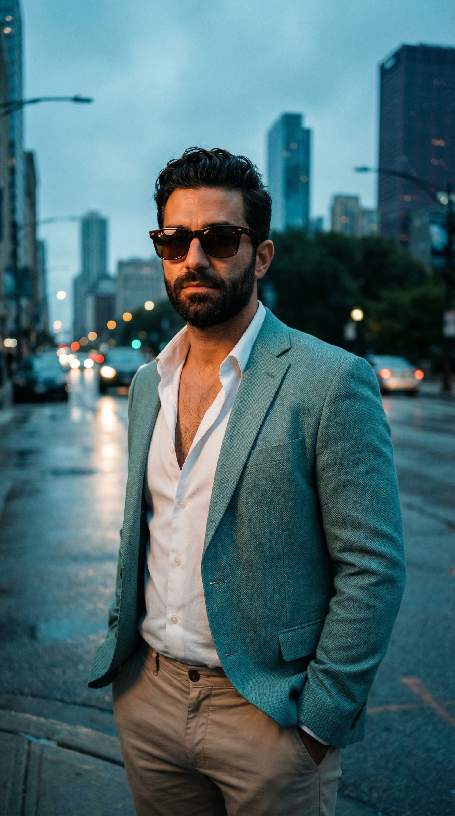 A stylish man with sunglasses stands on a city street after a rain. The cinematic lighting and blurred background of ...