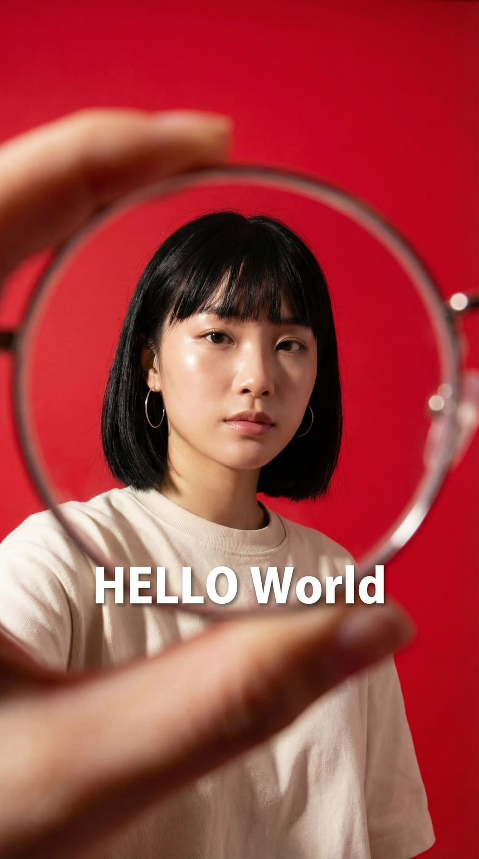 This image presents a stylish young woman against a vibrant red backdrop, evoking a bold and contemporary mood. Dress...
