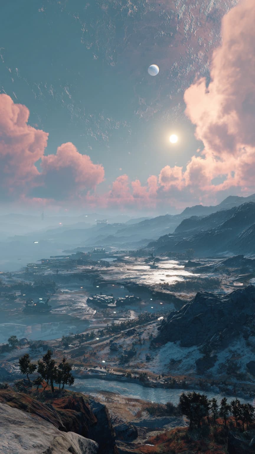 A stunning, ultra-wide landscape of the oceanic zone on planet Thalassia Prime, ...