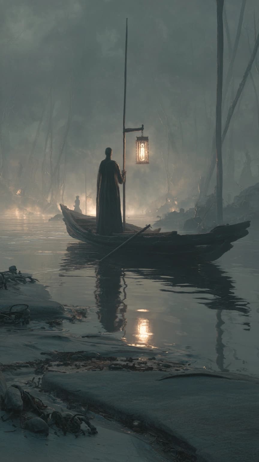 A serene and somber wide shot captures the moment of transition, as a tall, shro...