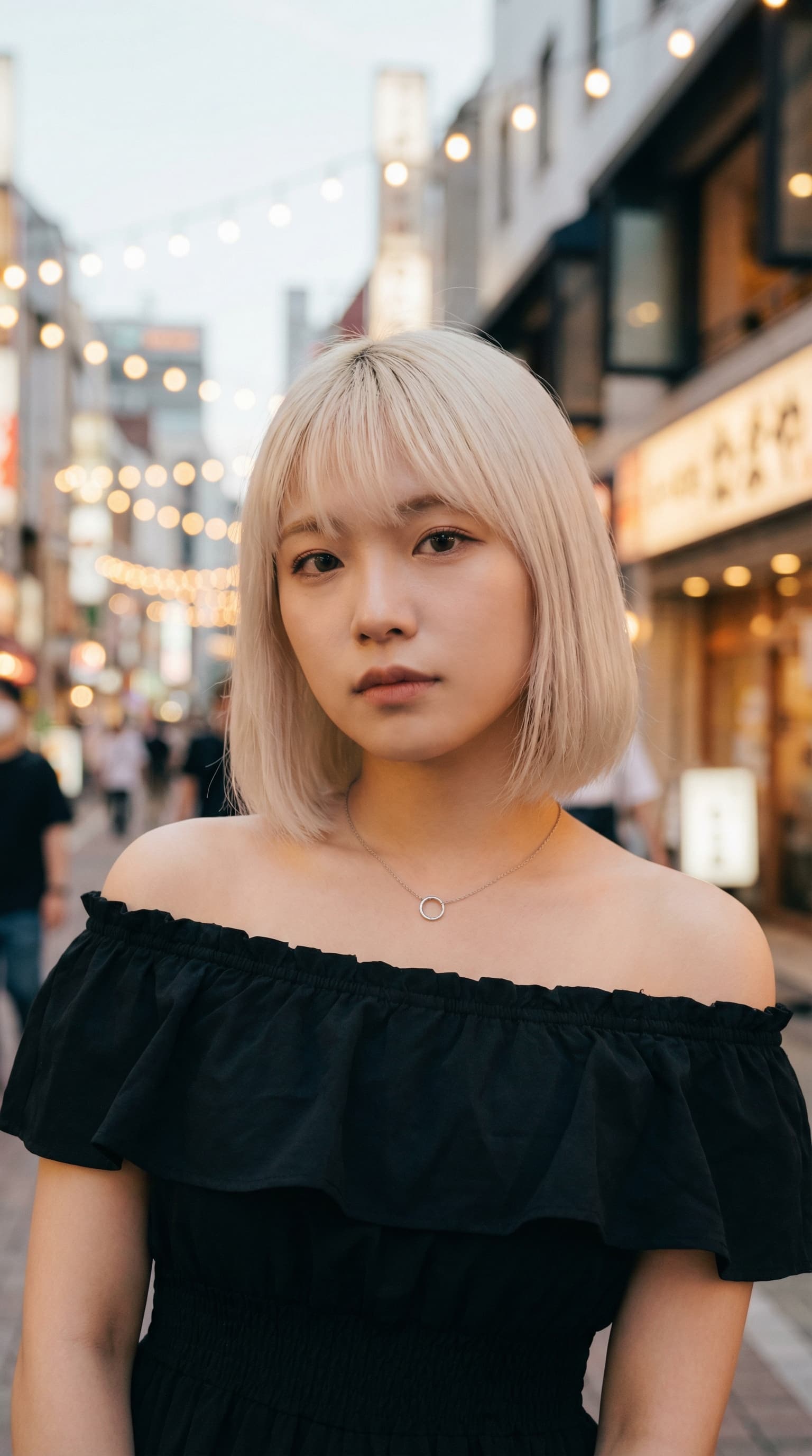 A young woman with platinum blonde hair poses against the soft glow of an urban streetscape. Her off-the-shoulder bla...