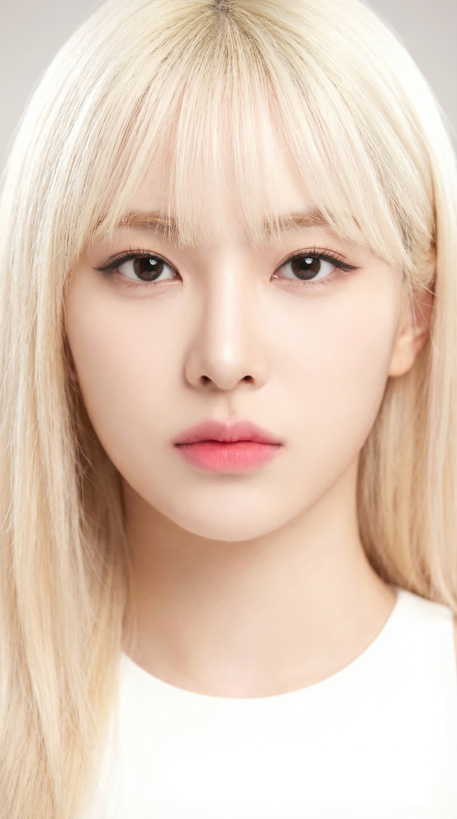 This portrait presents a young woman with pale blonde hair and a direct gaze, her expression serene. Shot in a minima...