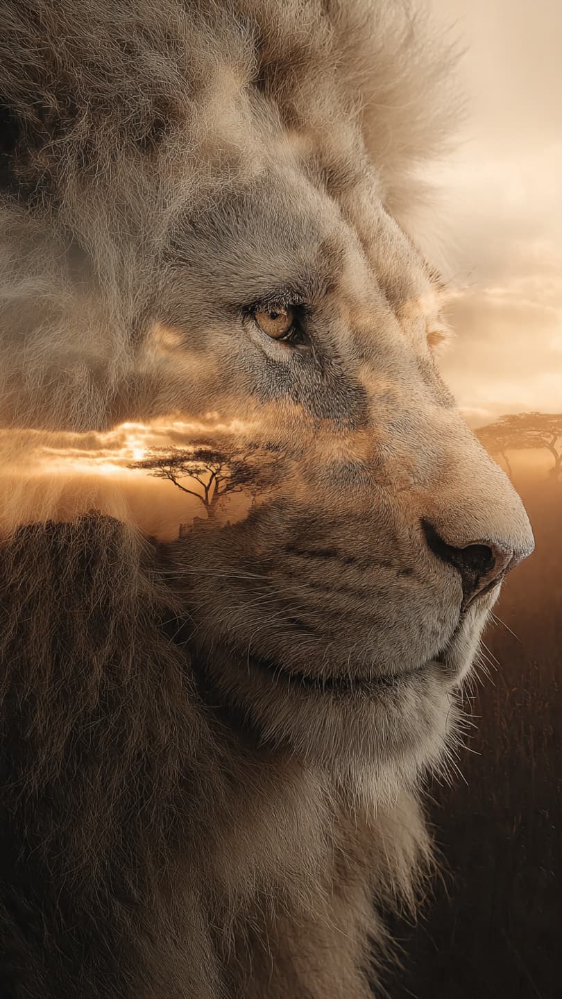 Double exposure of a majestic lion's face, merged with the African savanna at go...