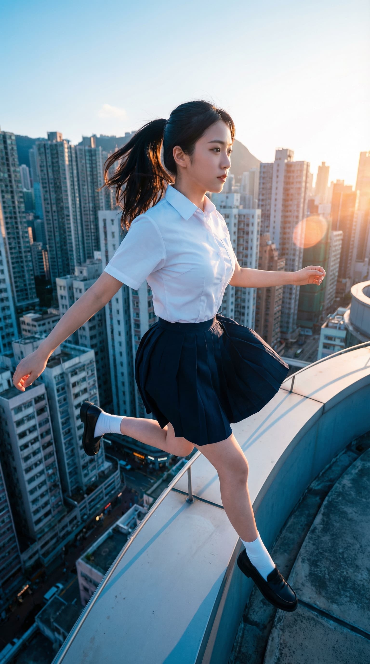 A young woman in a school uniform leaps across a rooftop. The setting sun illuminates the urban skyline, creating a s...