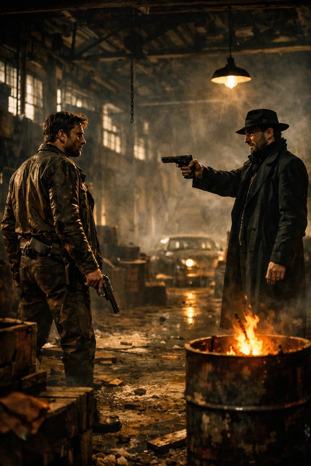 A tense standoff unfolds in a gritty, industrial space as two men face off, each holding a gun. Light catches the pud...