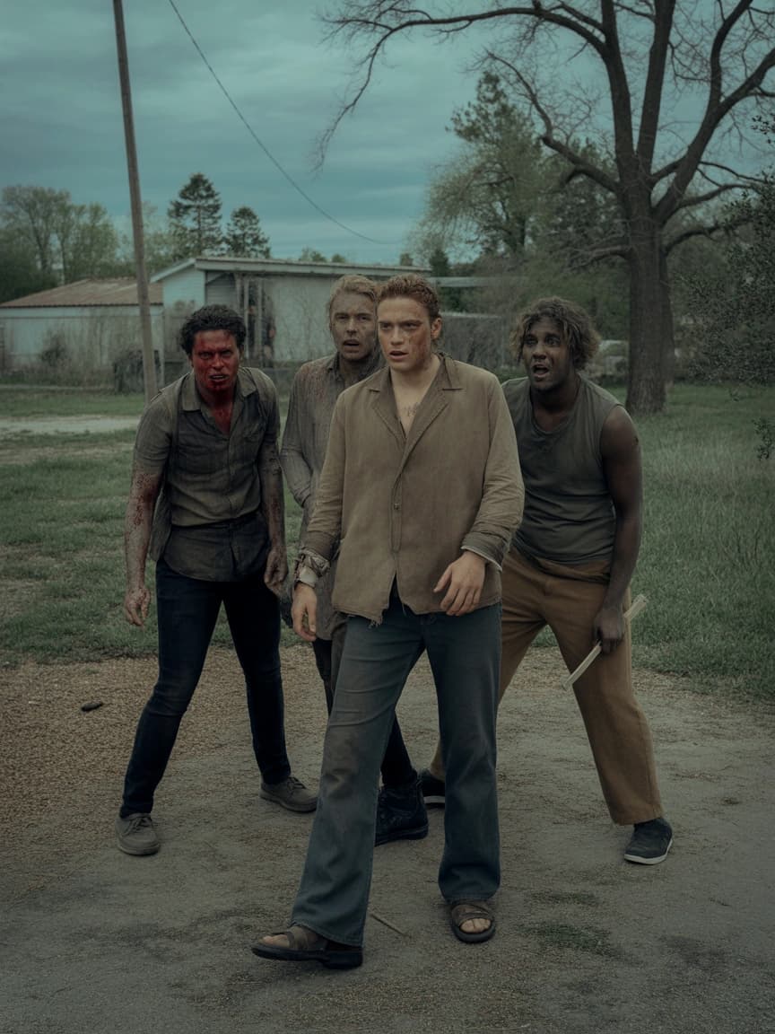 A group of disheveled figures, some bloodied and wielding makeshift weapons, stand on a desolate road under a forebod...
