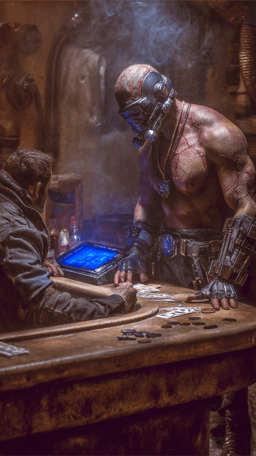 A gritty, tense standoff unfolds in the dimly lit Rusty Nebula Cantina on the ou...