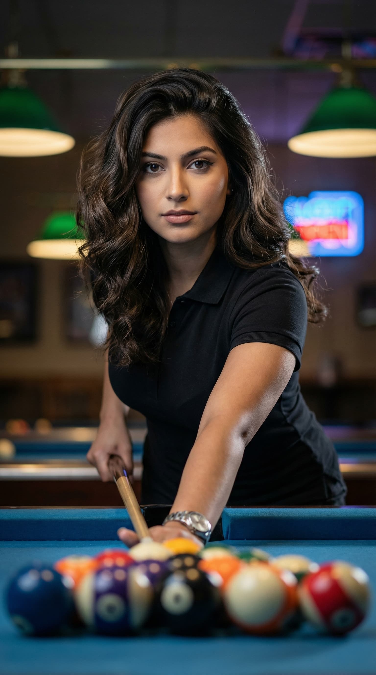 A young woman lines up a shot at a dimly lit billiards hall. The cool blues of the pool table contrast with the warm,...