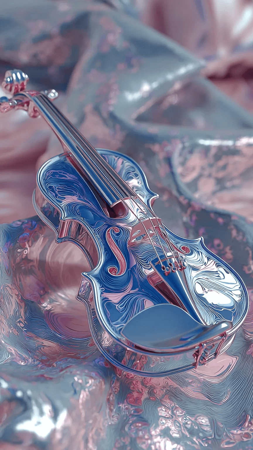 A blue and pink crystalline violin in the middle, with a blue and pink pattern, ...