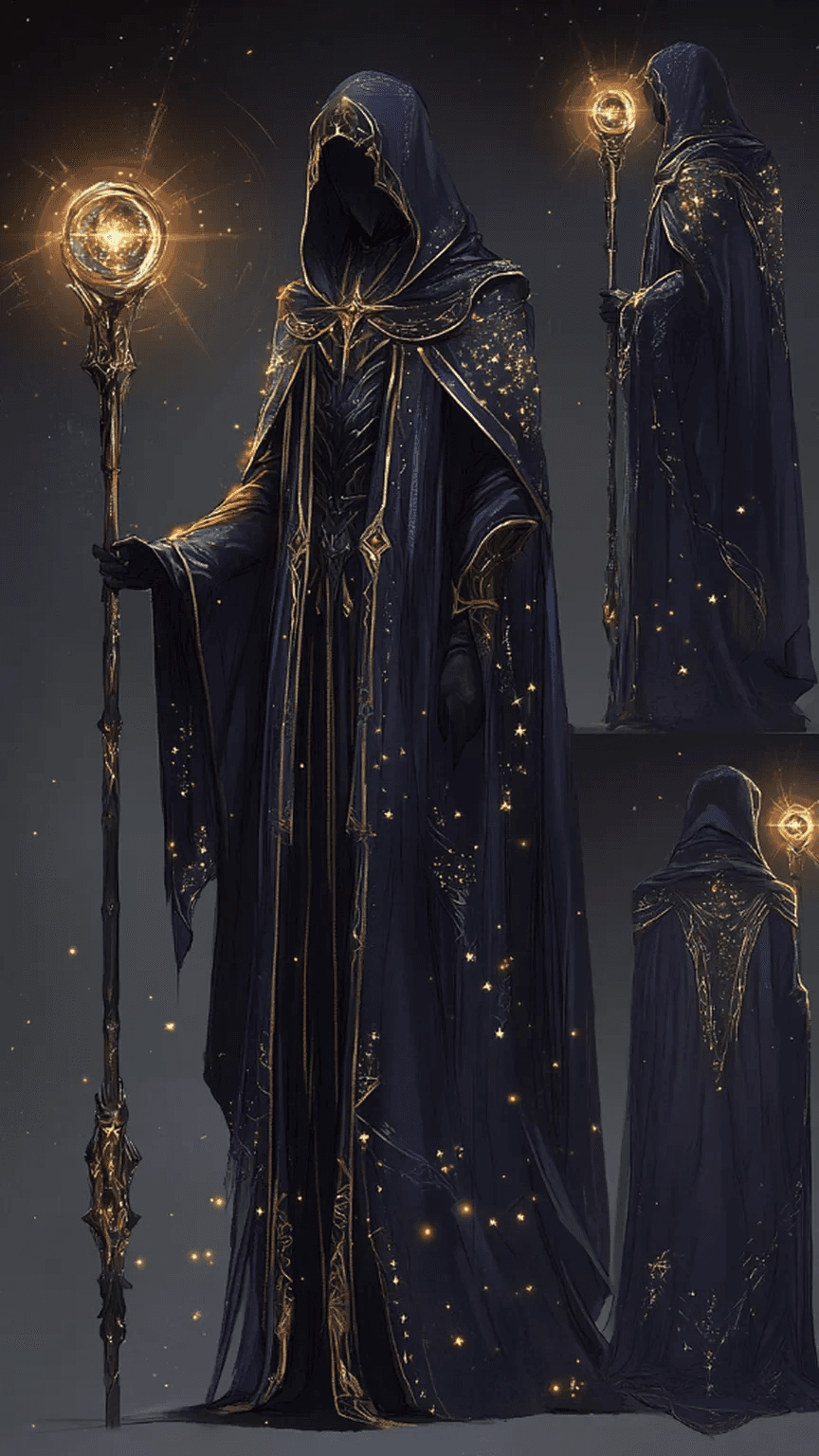 A fantasy mage character sheet with multiple angles: front, side, and back. The ...