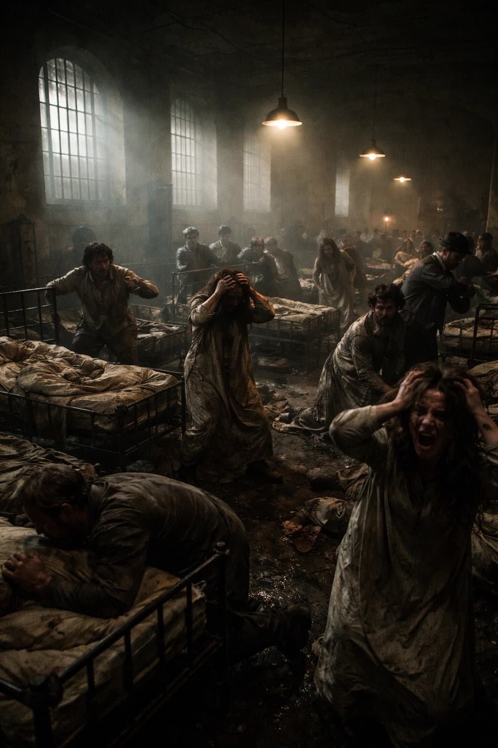 A large, distraught crowd occupies a cavernous room suggestive of a prison or asylum. Pale light filters through tall...