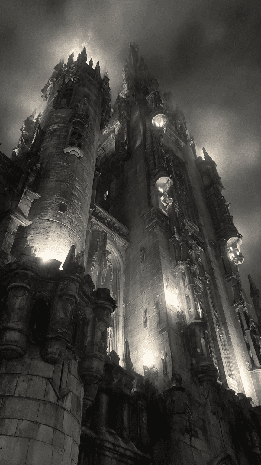 A mysterious, Gothic castle in the style of H.R. Giger, with dark, brooding towe...
