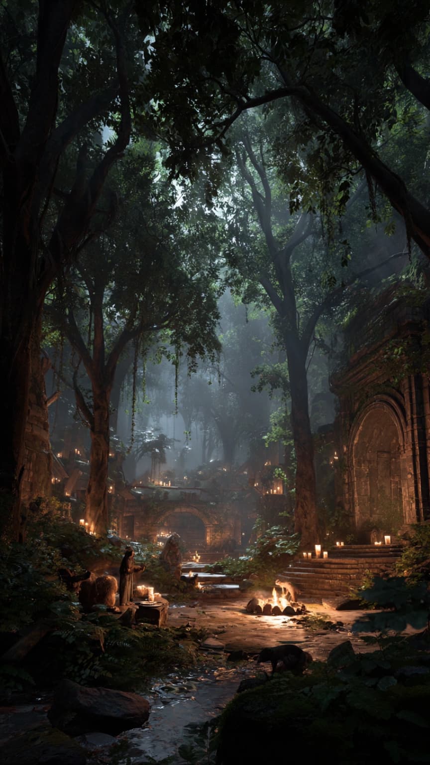 A serene and mystical scene unfolds in a sacred forest circle, with an elder per...