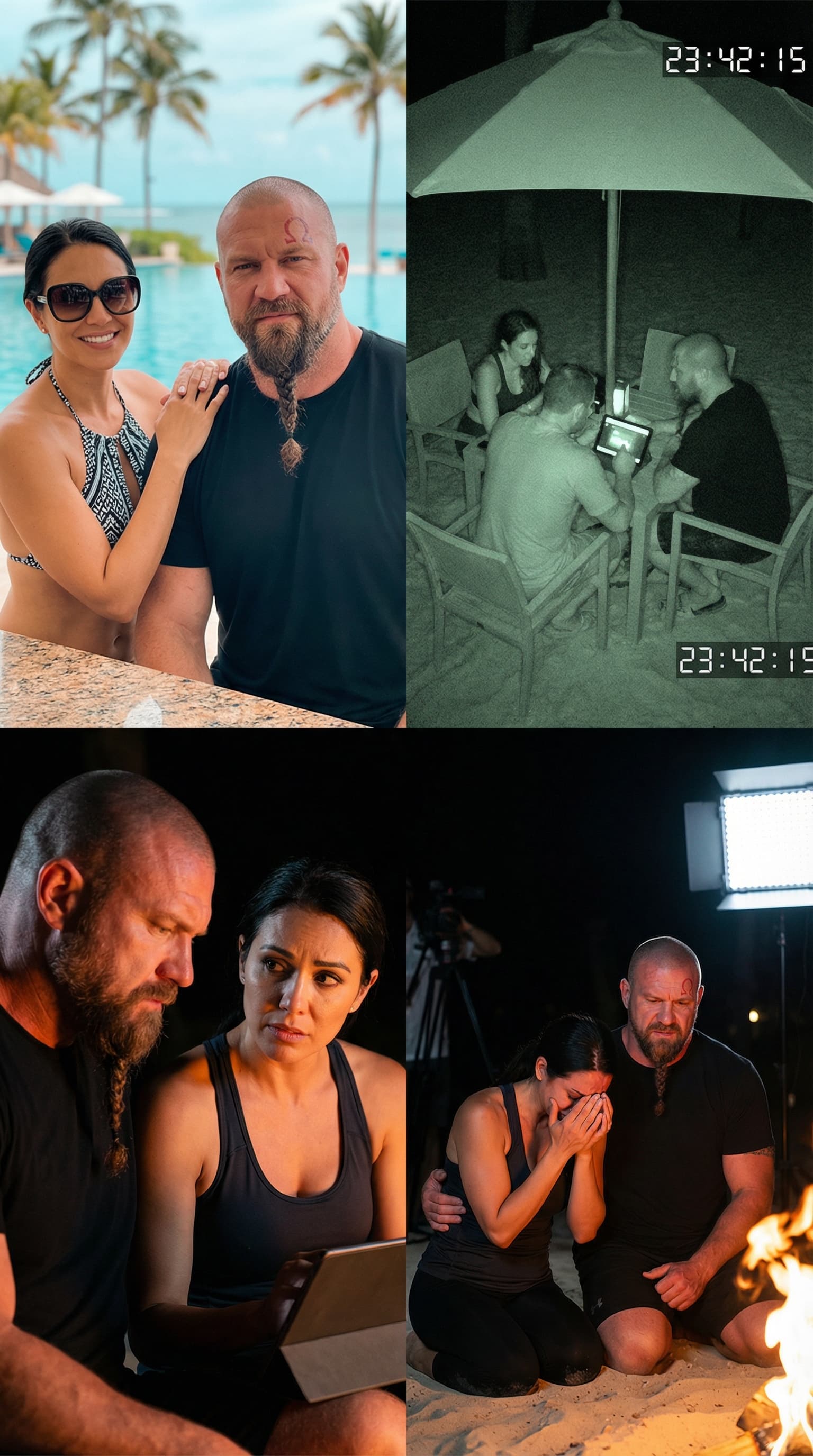 This multi-paneled image tells a story of a couple experiencing a range of emotions in tropical locales. From a happy...