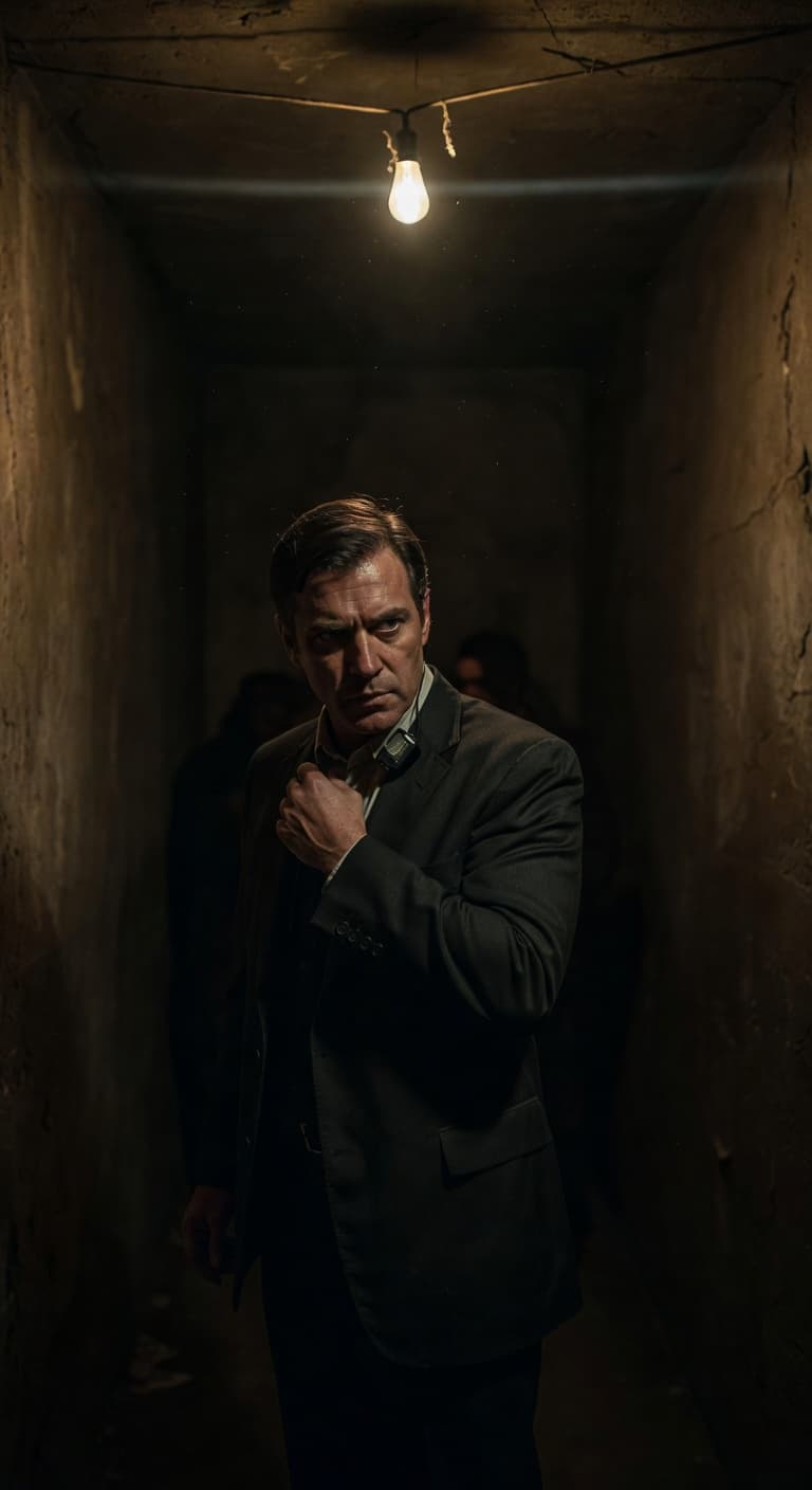 A man in a dark suit stands in a dimly lit, claustrophobic corridor. The single bare bulb overhead casts harsh shadow...