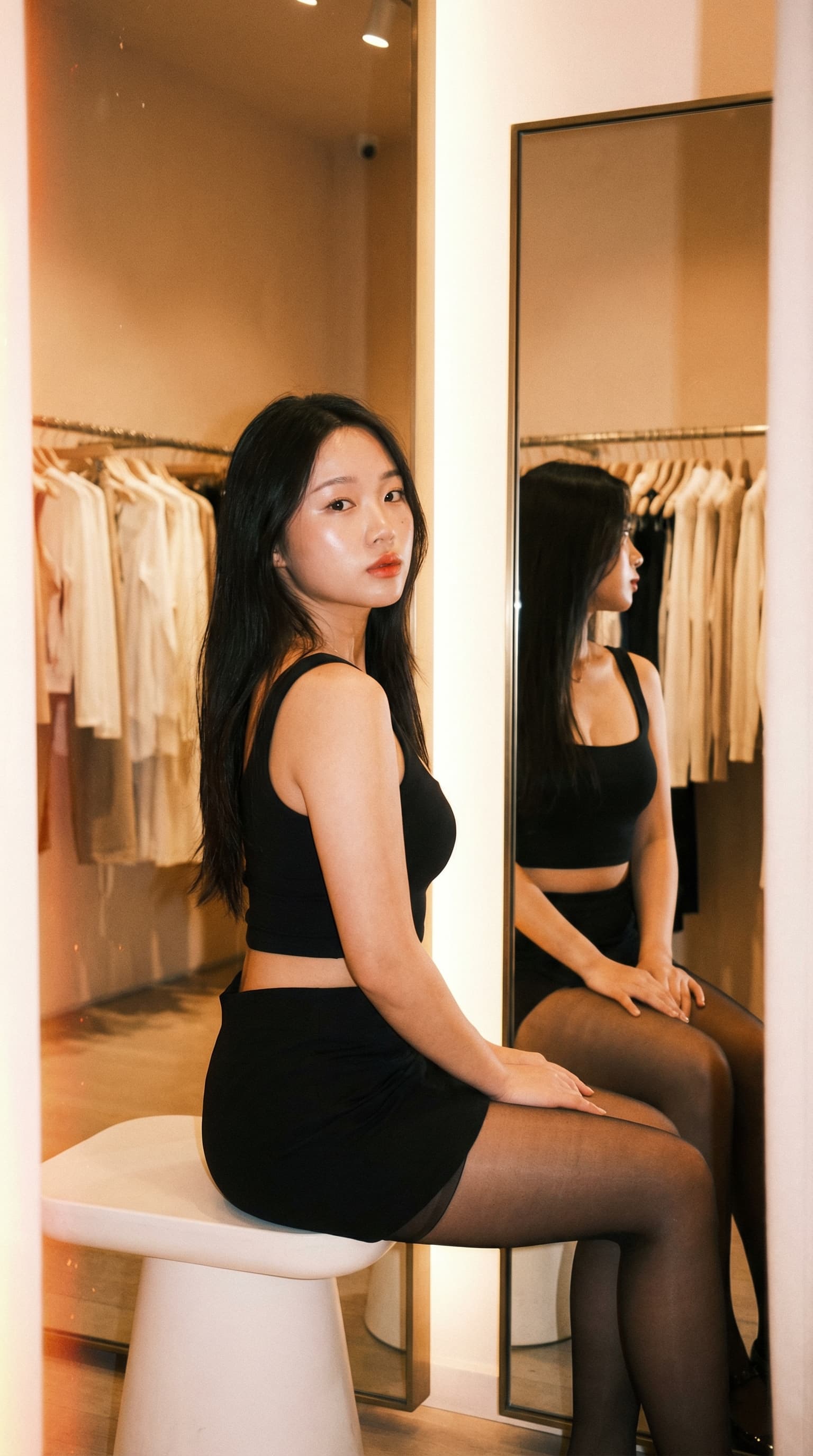 A young woman in a black outfit sits in a dressing room, glancing over her shoulder with a poised expression. Soft, w...