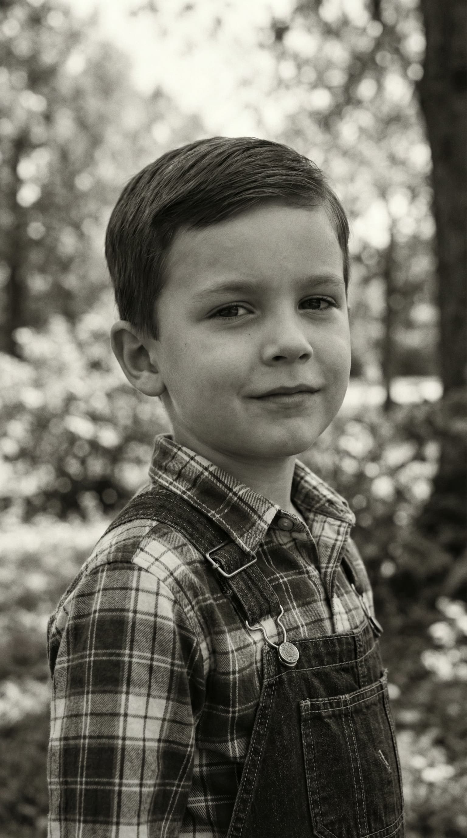 This black and white portrait captures a young boy in a plaid shirt and overalls, standing outdoors. His slight smile...
