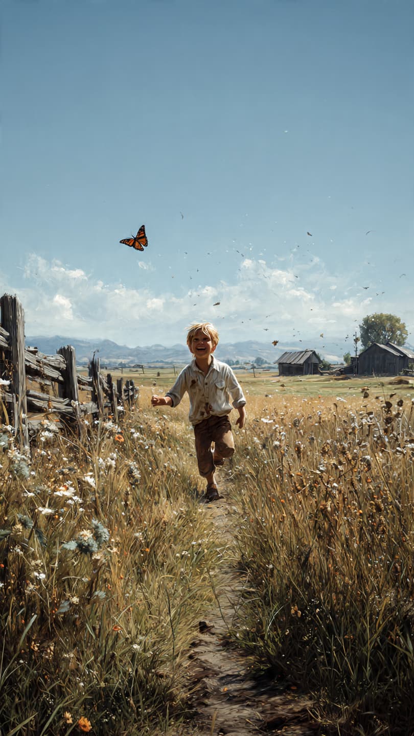 Child in a field, chasing a butterfly. Laughter caught mid-air. Grass stains on ...