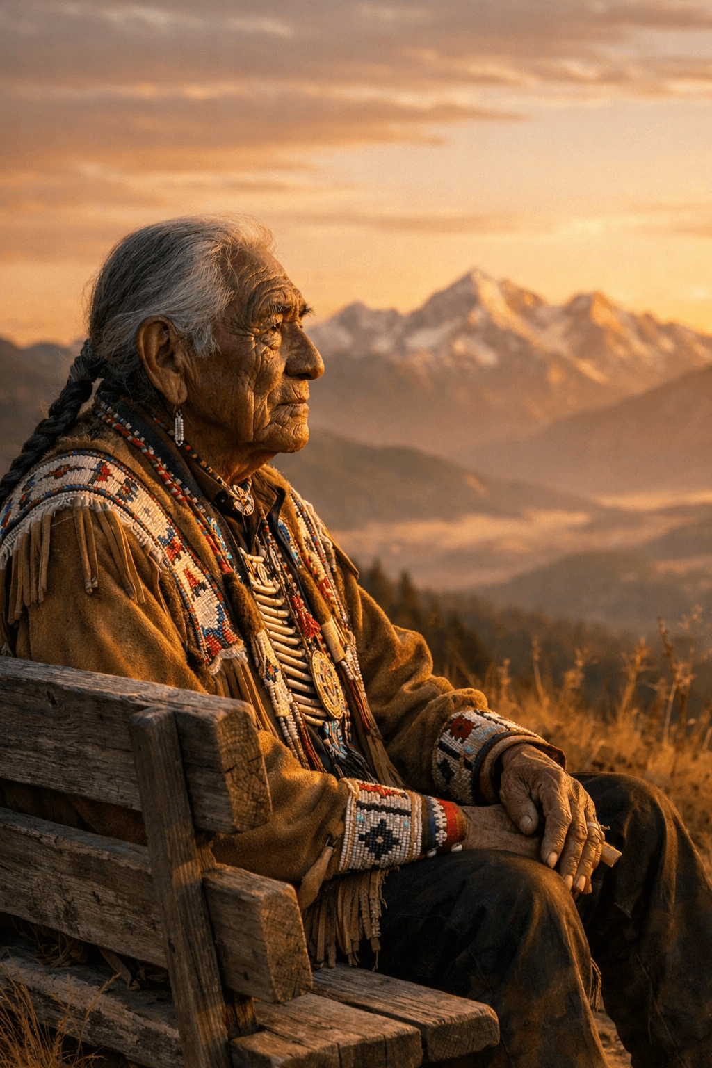 An elderly Indigenous man in his late 80s sits on a weathered wooden bench, gazi...