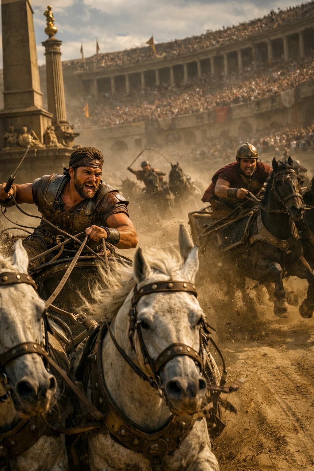 This dynamic image captures the intensity of a Roman chariot race, complete with roaring crowds and fierce competitor...