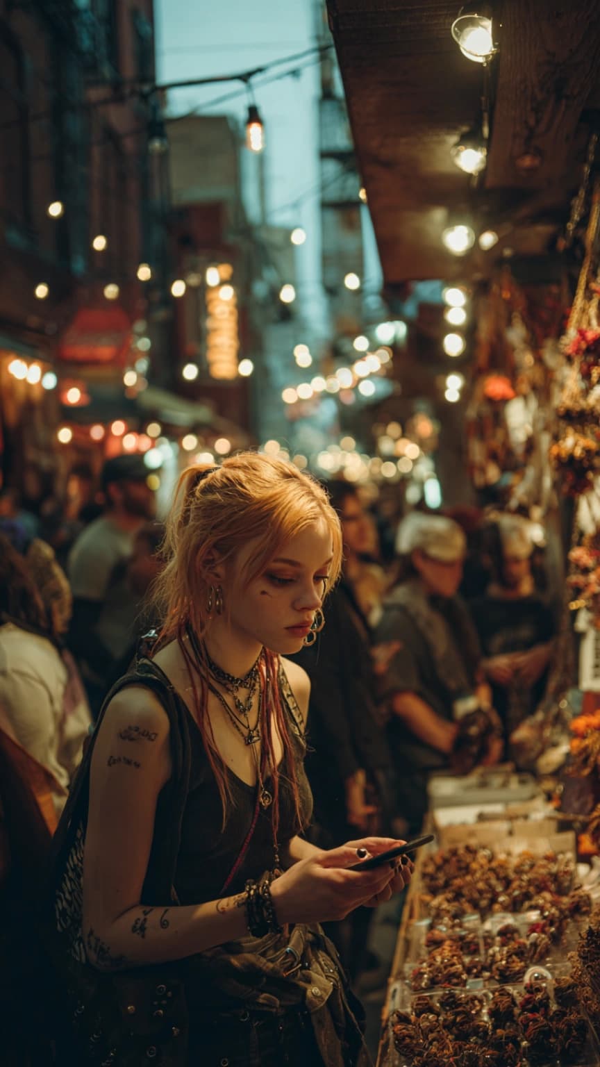 A vibrant, mysterious scene unfolds as a young witch navigates the bustling Arca...