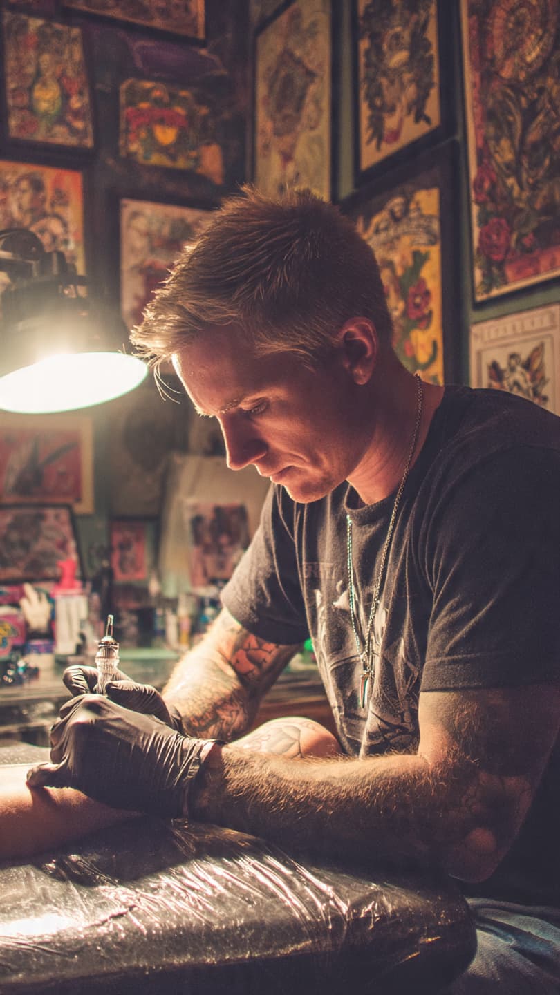 Tattoo artist at work, needle in hand. Concentrated gaze. Ink on skin. Urban tat...