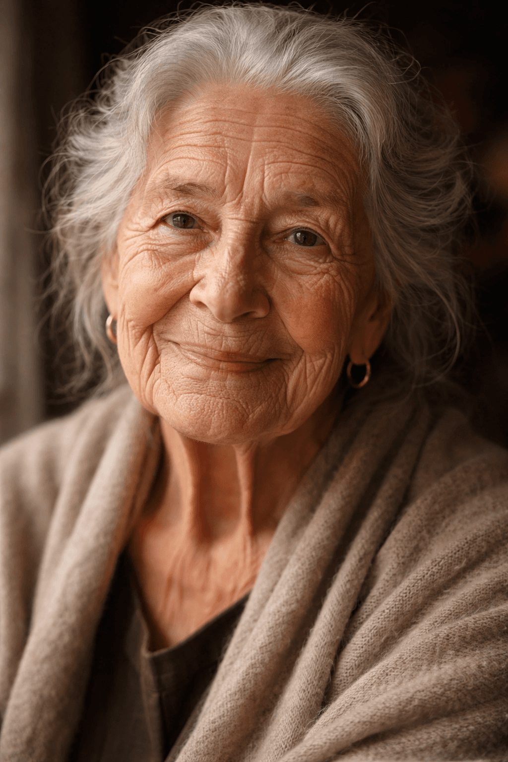 A close-up portrait of a wise old woman with wrinkles that tell a story, kind ey...