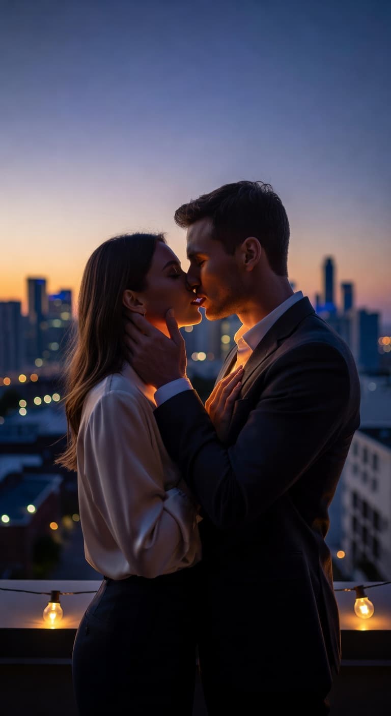 A couple dances intimately in a grand ballroom illuminated by glittering chandeliers. The woman's emerald gown swirls...