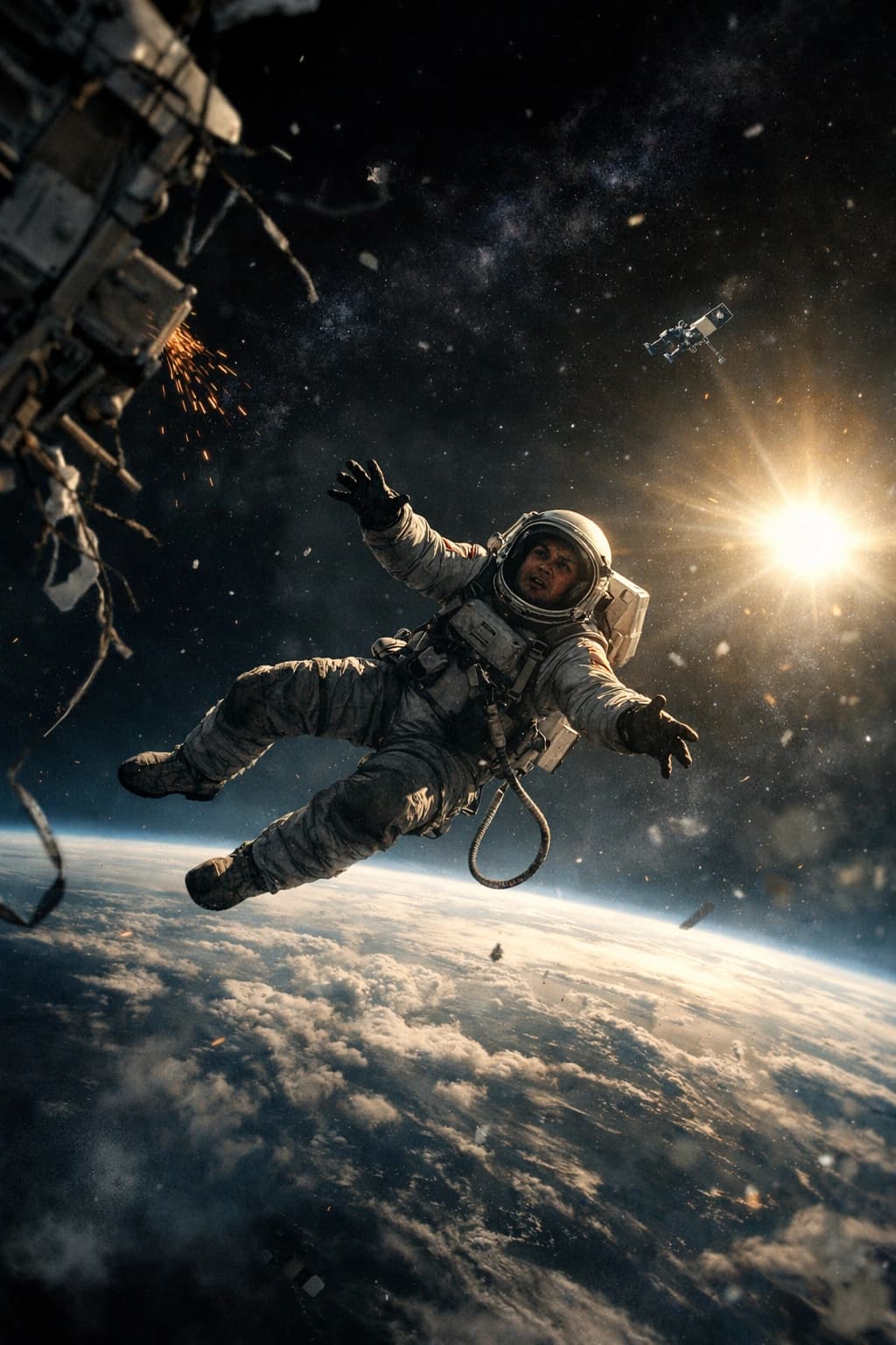 An astronaut tumbles through the void of space, Earth a swirling canvas below. Debris from a damaged spacecraft fills...