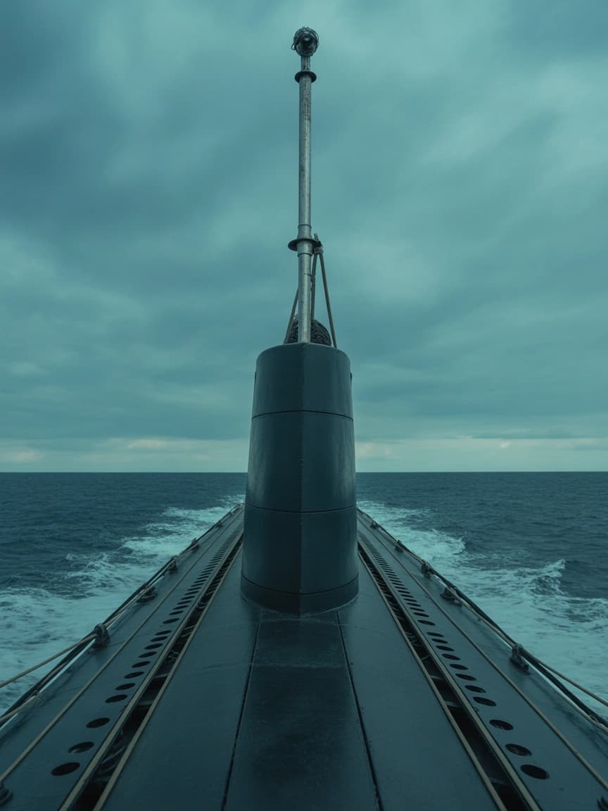 An austere, monochromatic view from atop a submarine cleaving through a turbulent sea. The vessel's conning tower ris...